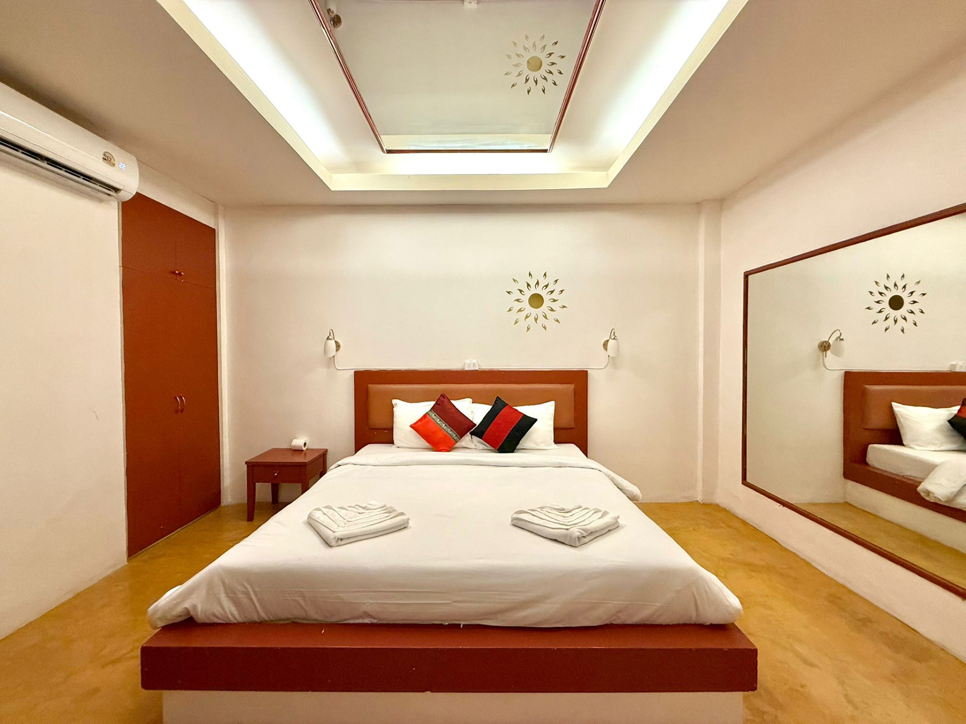 A typical very spacious, basic furnished room with a 2-person kingsize bed, affordable priced, on a beautiful garden resort with pool. The room is equipped with airconditioning, fridge and a bathroom with hot water.
